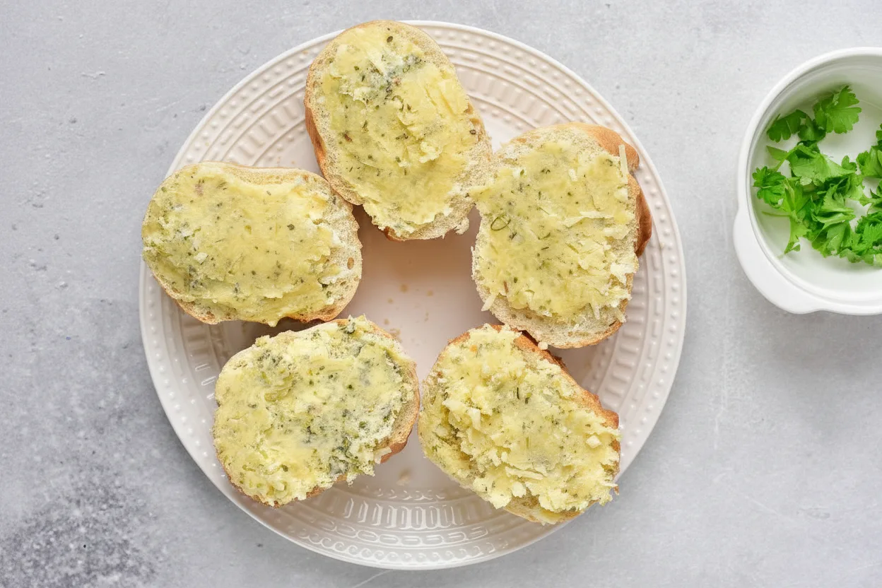 - Spread a generous amount of the garlic butter mixture onto each slice of bread.