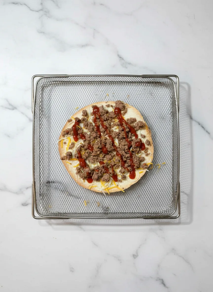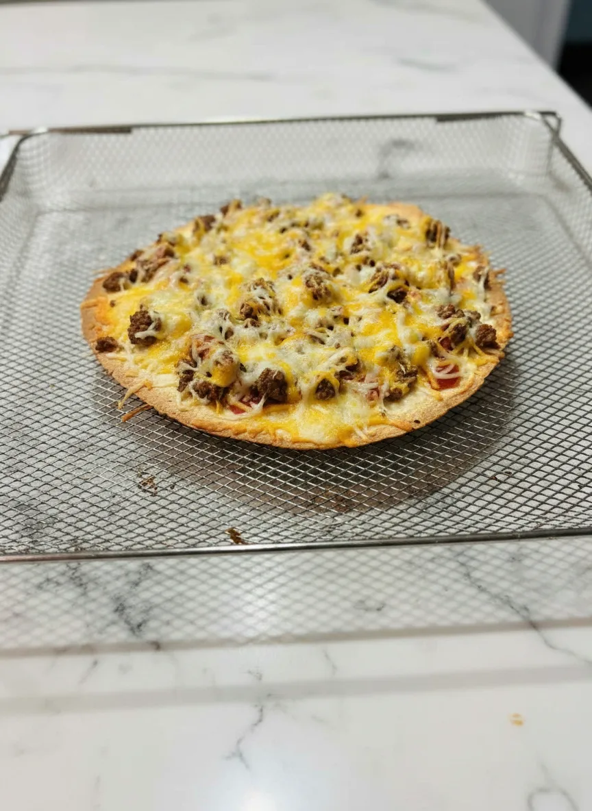 A crispy, cheesy Mexican-inspired pizza made quickly in the air fryer with layers of tortillas, beans, seasoned meat, and zesty toppings.