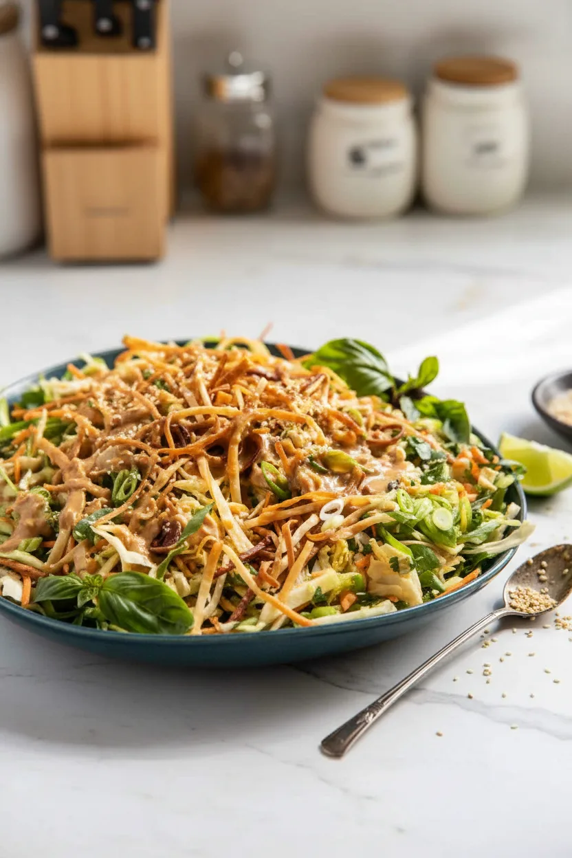 Top your salad with crispy wontons, sesame seeds, green onions, and an extra squeeze of lime juice. For optimal crunch, serve immediately after adding wontons. Pair it with other meal components like bakery-style pistachio muffins for a complete spread.