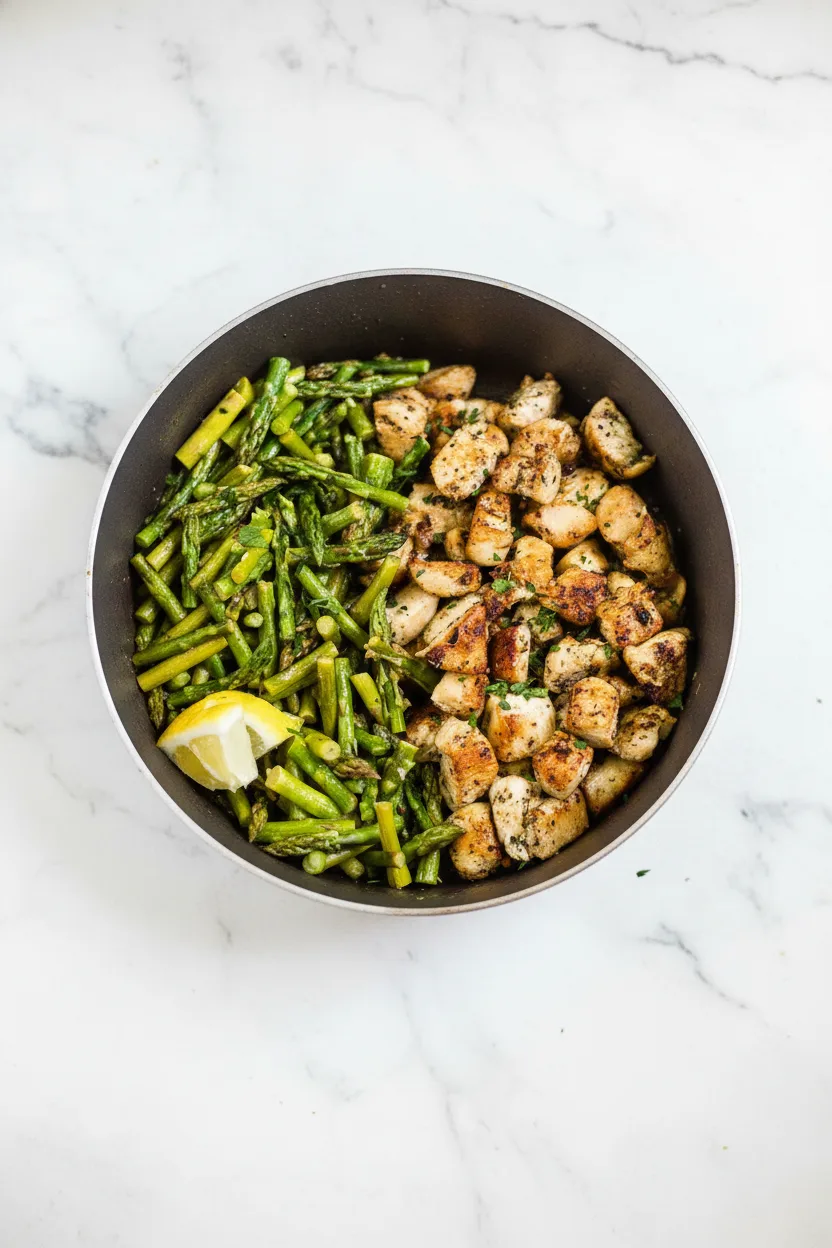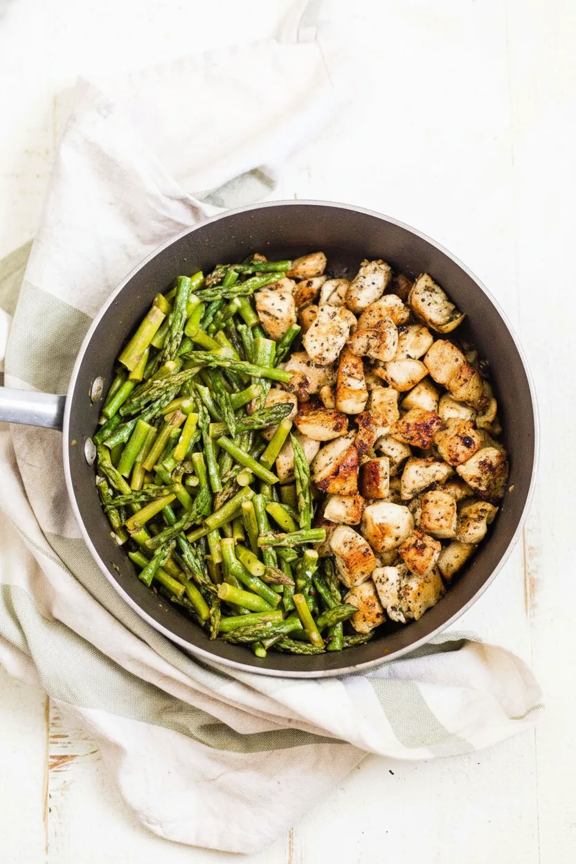 Use a 12-inch heavy-bottomed skillet for best results. This ensures proper browning space for the chicken and room for the asparagus.
