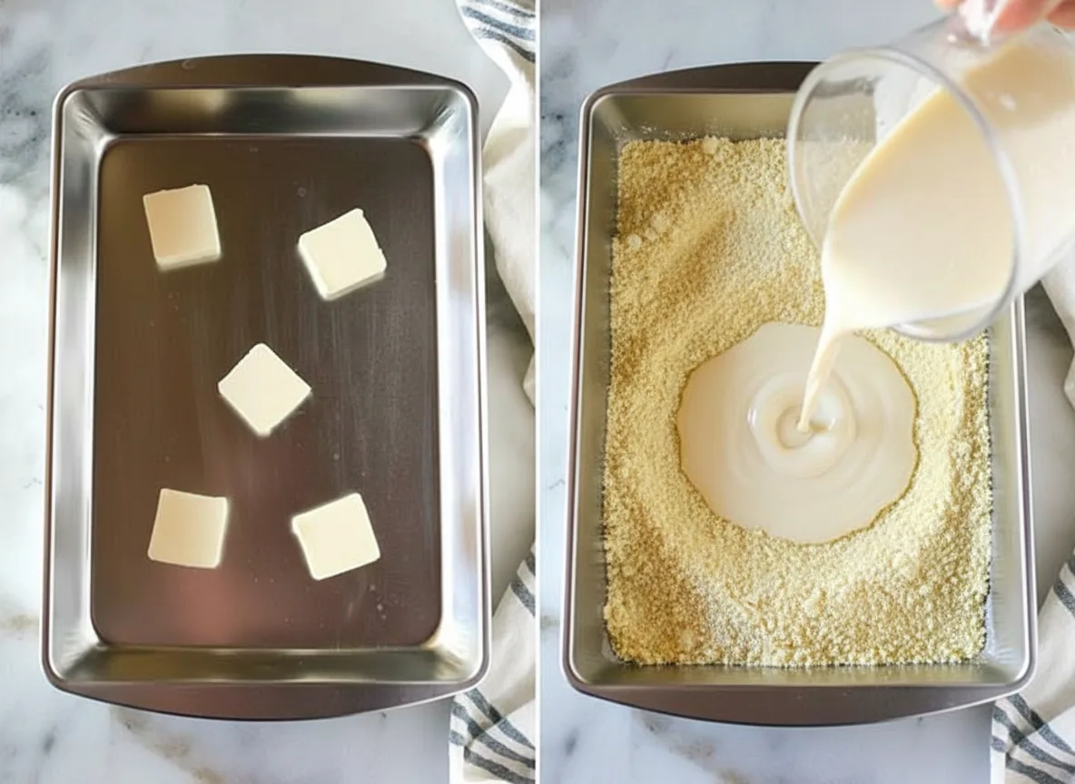 - Pour batter into baking dish, over melted butter.