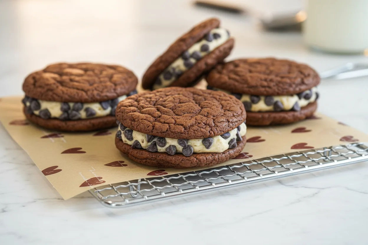 What makes these stand out? First, the brownie cookies bake up fudgy yet sturdy enough to sandwich. Second, the cookie dough filling tastes just like classic chocolate chip dough without any concerns.