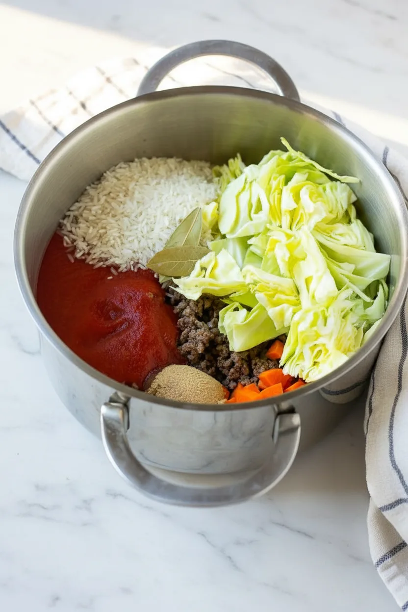 Add chopped cabbage, sliced carrots, beef broth, tomato sauce, uncooked rice, bay leaf, and brown sugar to the pot. Season generously with salt and pepper. Stir until all ingredients are evenly distributed.