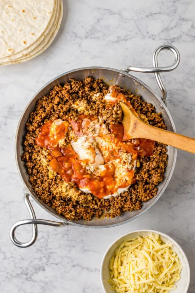 Reduce heat to low then stir in cream cheese, sour cream, and salsa until the mixture becomes smooth and creamy. Fold in shredded cheese until everything melts together beautifully. Remove skillet from heat once incorporated.