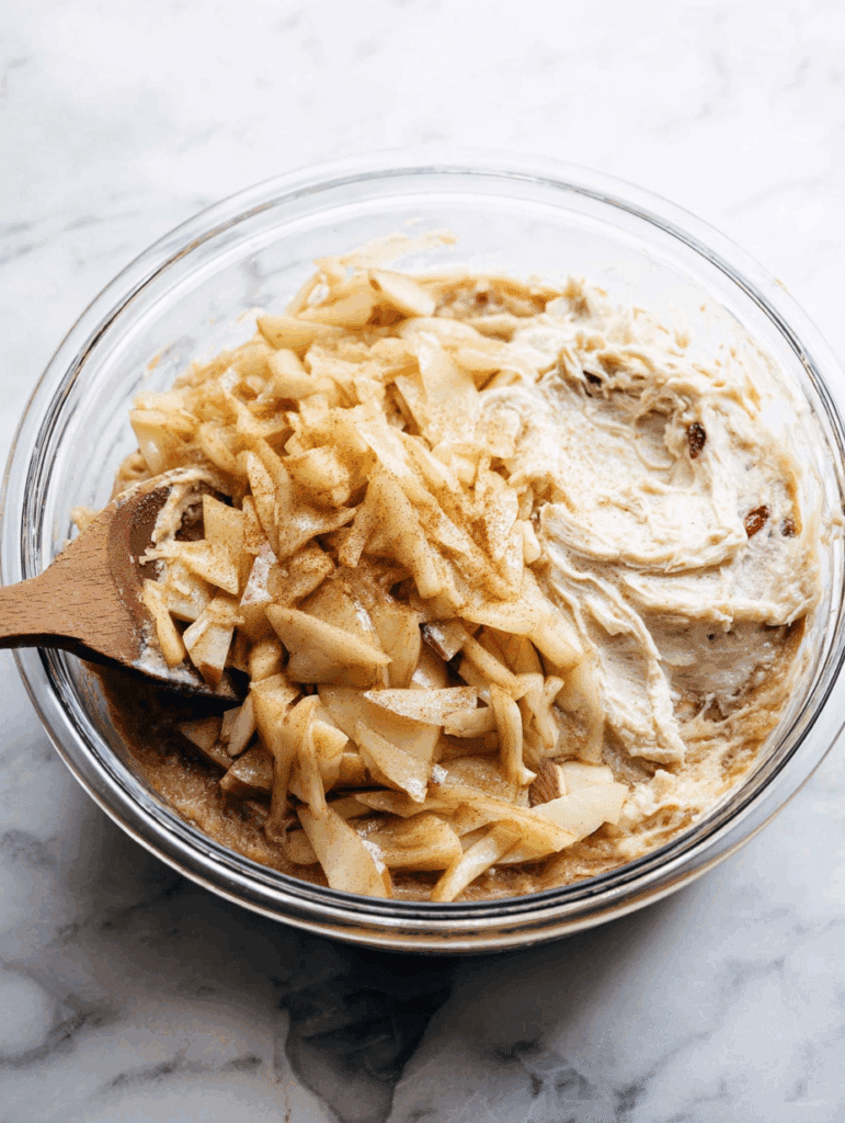 Before adding the apples to your batter, be sure to cut them into small, even pieces. You can peel them or leave the skin on, depending on your preference. The smaller you dice them, the more evenly they’ll distribute through the cake. A fine dice also helps the apples cook through without becoming soggy or overpowering.
