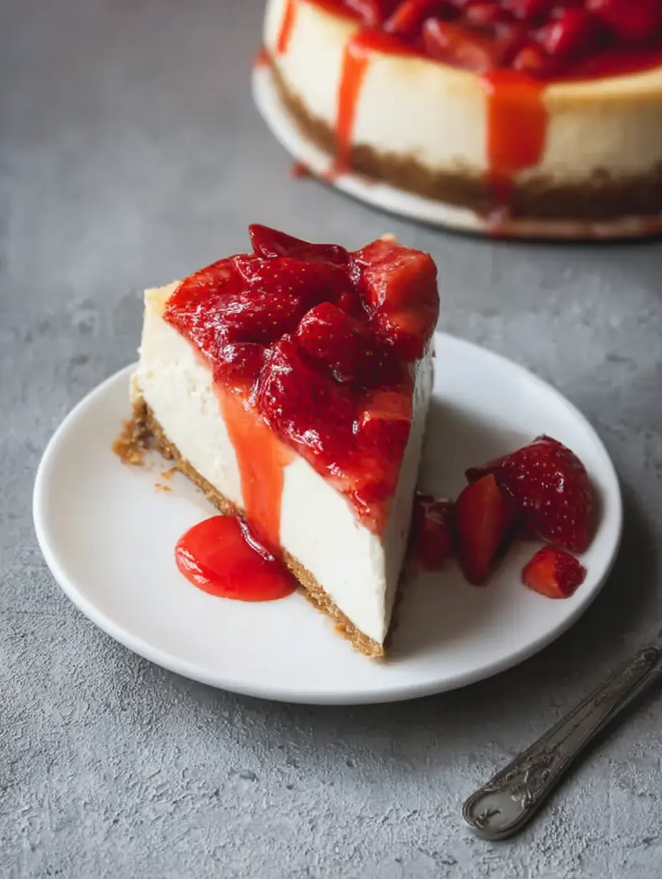 A stunning and creamy baked cheesecake with a buttery graham cracker crust and a vibrant fresh strawberry topping. The ultimate homemade dessert for any celebration.