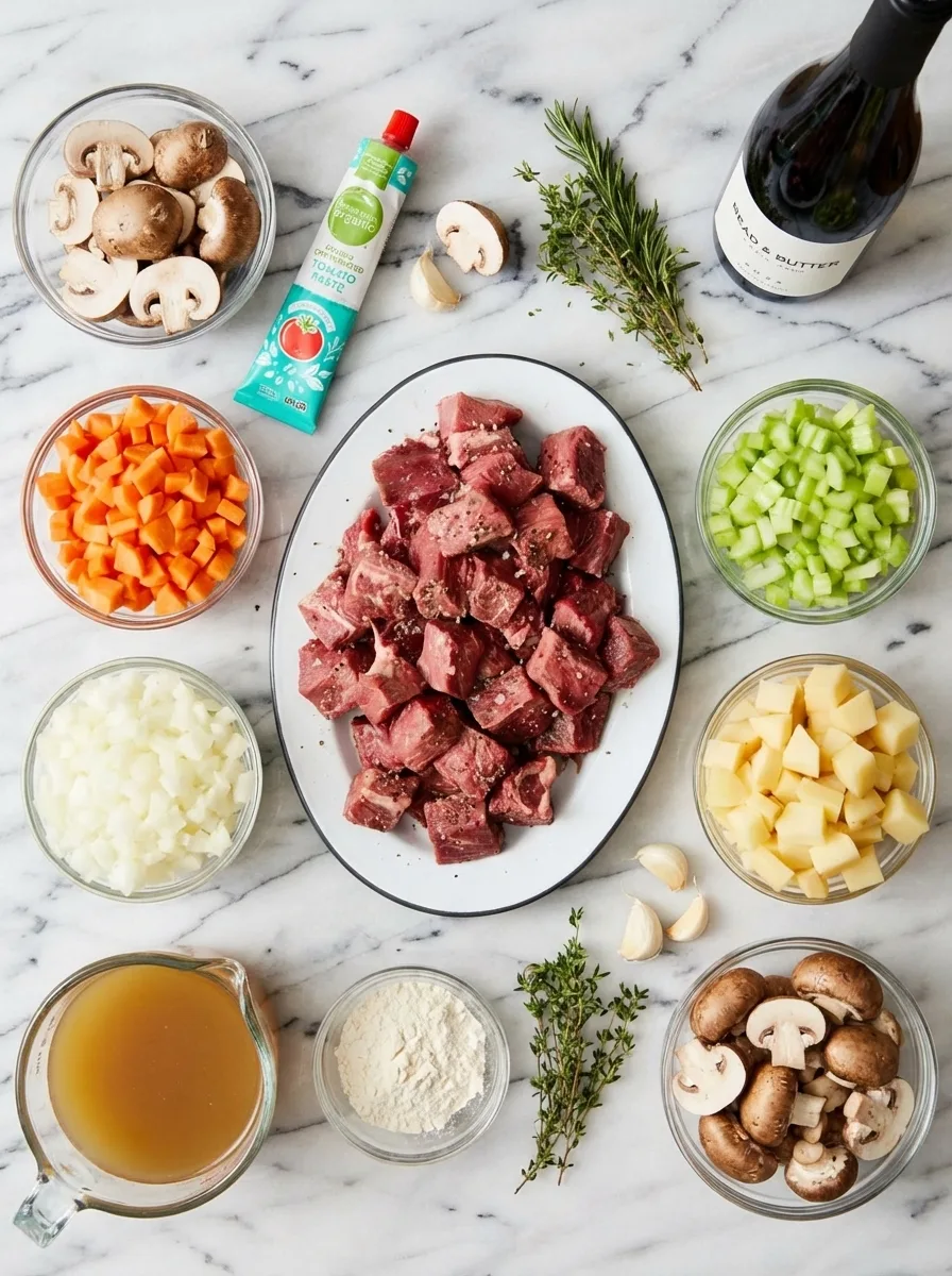 A hearty beef stew with tender meat, carrots, mushrooms and potatoes in rich savory broth