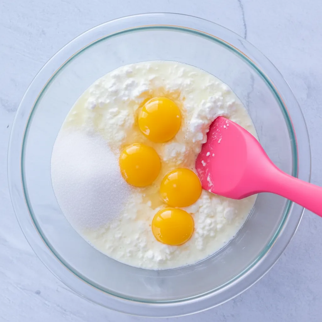 - Combine all ingredients in the following order – cheese, eggs, vanilla flavoring, sugar, baking powder and flour. Mix each time you add an ingredient.