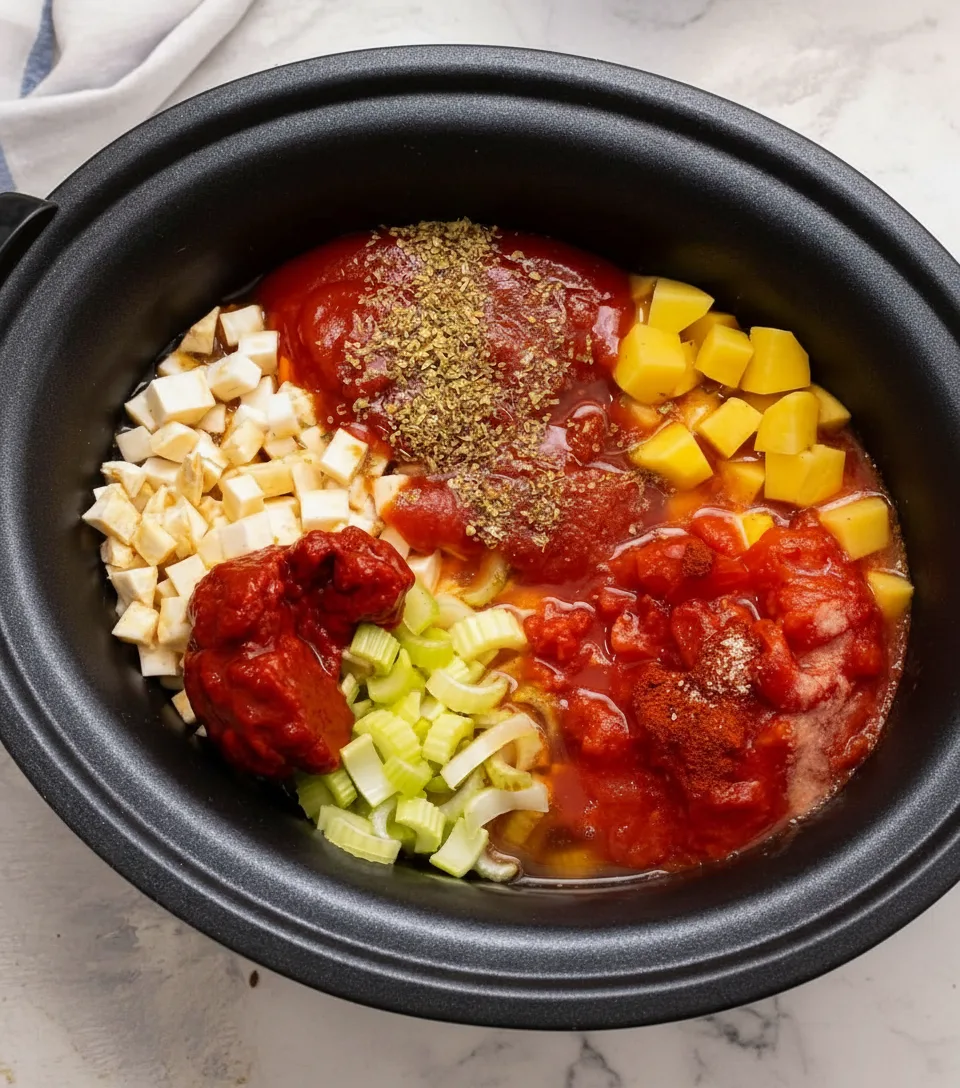 Place carrots, potatoes, parsnips, and celery in the cooker. Add diced tomatoes with juices, tomato sauce, tomato paste, Worcestershire, oregano, paprika, sugar, 2 ½ cups broth, and remaining salt.