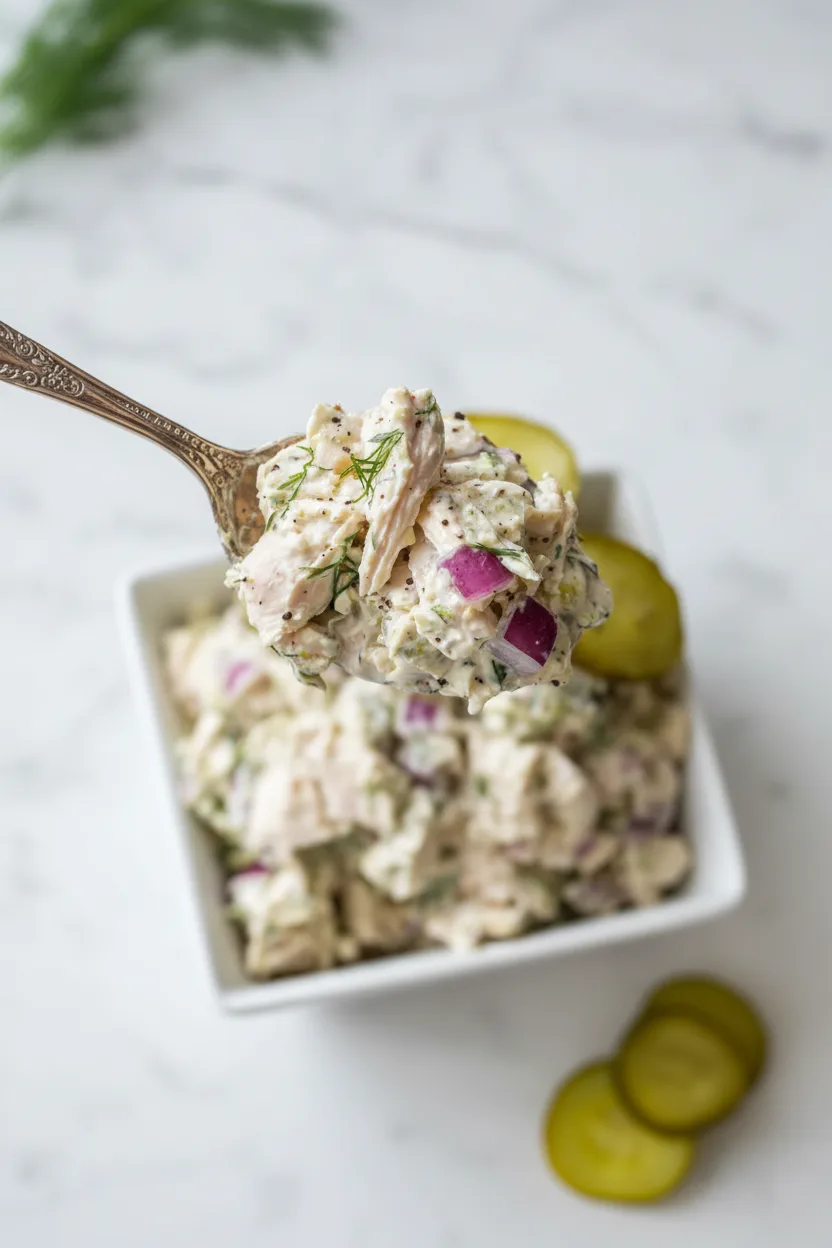 Tangy chicken salad with crunchy dill pickles and creamy Greek yogurt dressing, ready in 10 minutes.