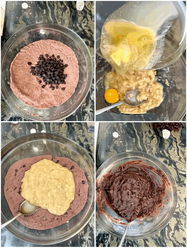Instead, stir just until everything is combined. The batter should look thick and slightly lumpy, with visible banana bits and chocolate chips. If you’re using a hand mixer or a stand mixer, use it only to mash the bananas and mix the wet ingredients. After that, switch to a spoon or spatula to fold everything together gently.