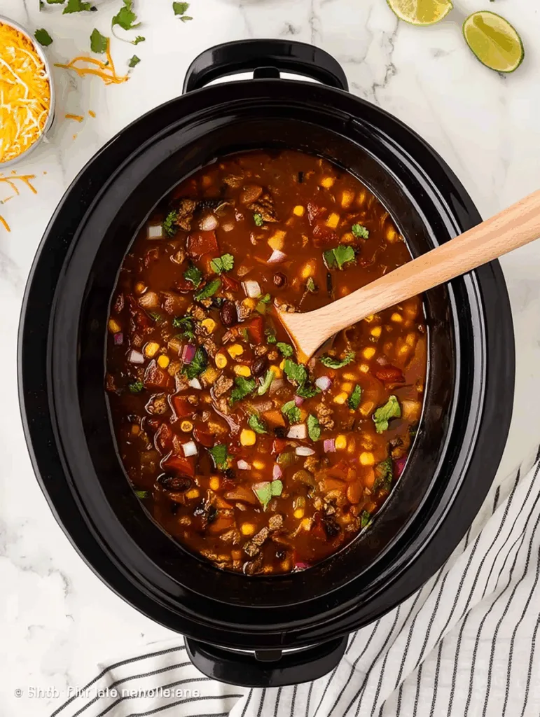The key to flavor starts with a quick browning of ground meat, onions, and garlic. Once the meat is perfectly golden and the onions are soft, all you need to do is pour everything else into your slow cooker. That includes fire-roasted tomatoes, two types of beans, tomato sauce, corn, diced green chiles, and taco seasoning. A splash of low-sodium broth ties it all together, creating a cozy base that simmers into something irresistible.