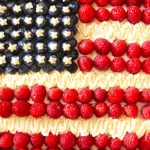 To create the “stars,” pipe a rectangle in the upper left corner and fill it with tight rows of blueberries. Add small frosting stars on top for extra detail. Then, make four snug rows of raspberries across the cake, leaving space between for the “white” stripes, which you’ll create by piping the remaining frosting.