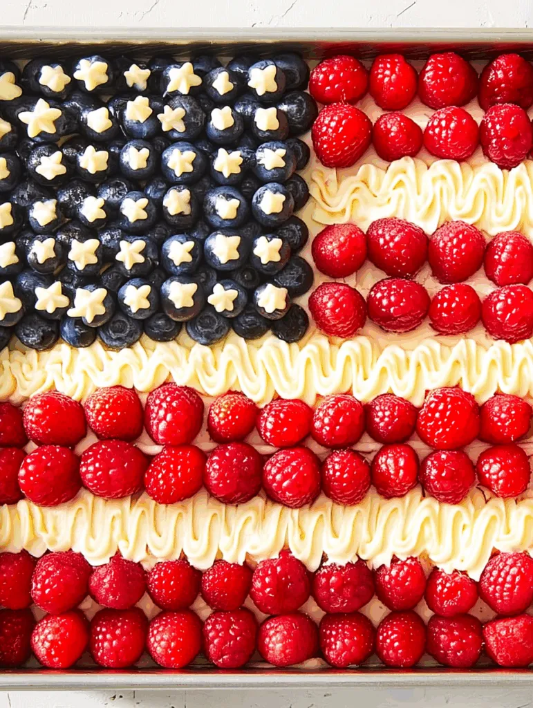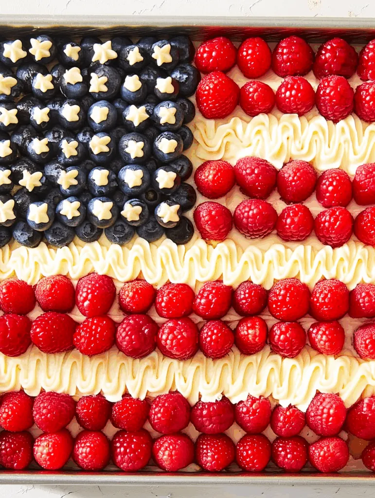 A bright and festive vanilla sheet cake topped with smooth cream cheese frosting and fresh berries, arranged to mimic the American flag.