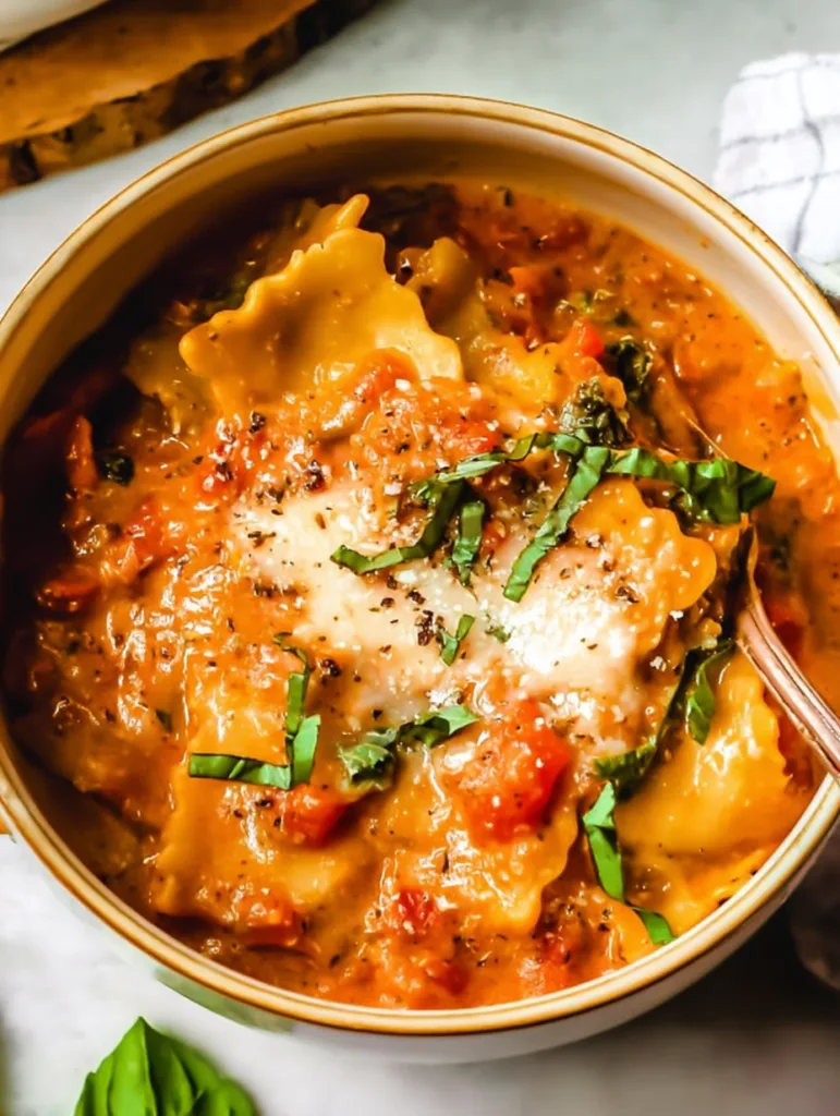 Each spoonful delivers pasta perfection wrapped in a velvety tomato broth amplified by melted cheeses and fresh herb brightness.