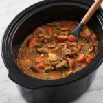 First, you’ll brown the meat to lock in juices before letting the crock pot work its magic. Next, hearty vegetables cook until fork-tender, absorbing the savory broth’s essence.