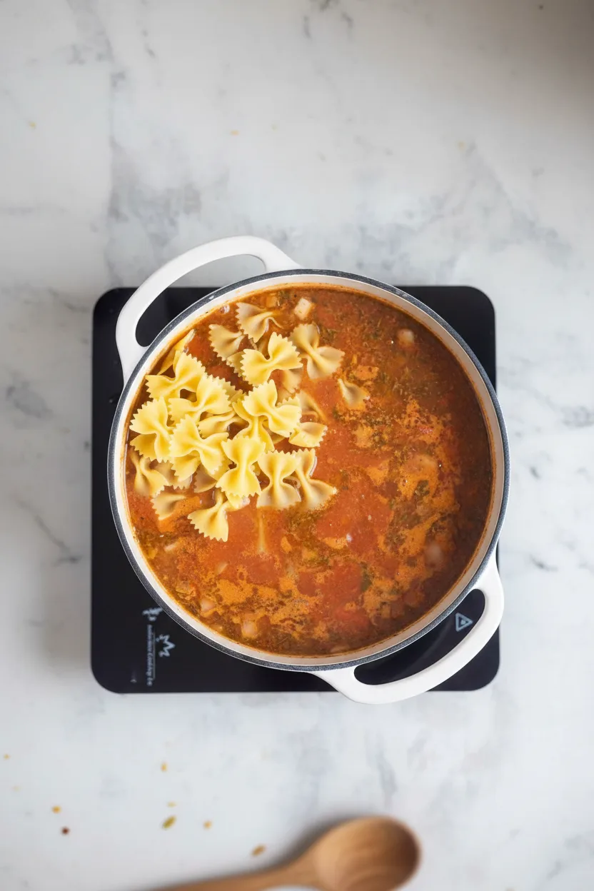 Uncover your pot and add bowtie pasta. Return to a simmer and cook for 11-13 minutes uncovered, stirring occasionally. Pasta should reach al dente texture while absorbing that glorious broth. Add remaining water gradually if the soup thickens excessively. Ladle adjustments maintain ideal consistency without dilution.