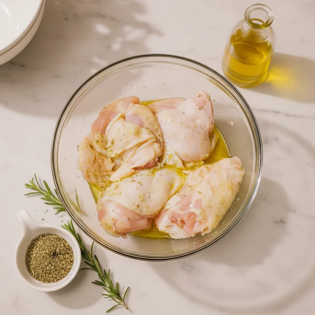 First, grab a large mixing bowl. Whisk together two tablespoons of olive oil, the lemon juice, minced garlic, and dried oregano. Next, add the chicken thighs to the bowl. Toss them thoroughly until each piece is coated in the fragrant marinade. Cover the bowl and let it rest in your refrigerator. Marinate for at least 15 minutes, but up to two hours for deeper flavor.
