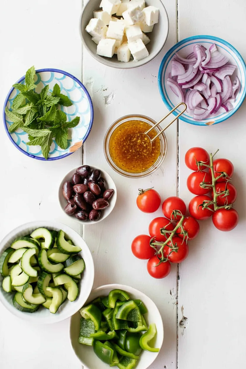 - Wash and prepare all vegetables. Cut tomatoes into wedges, slice cucumber into half-moons, cut bell pepper into strips, and thinly slice the red onion. Place in a large bowl.