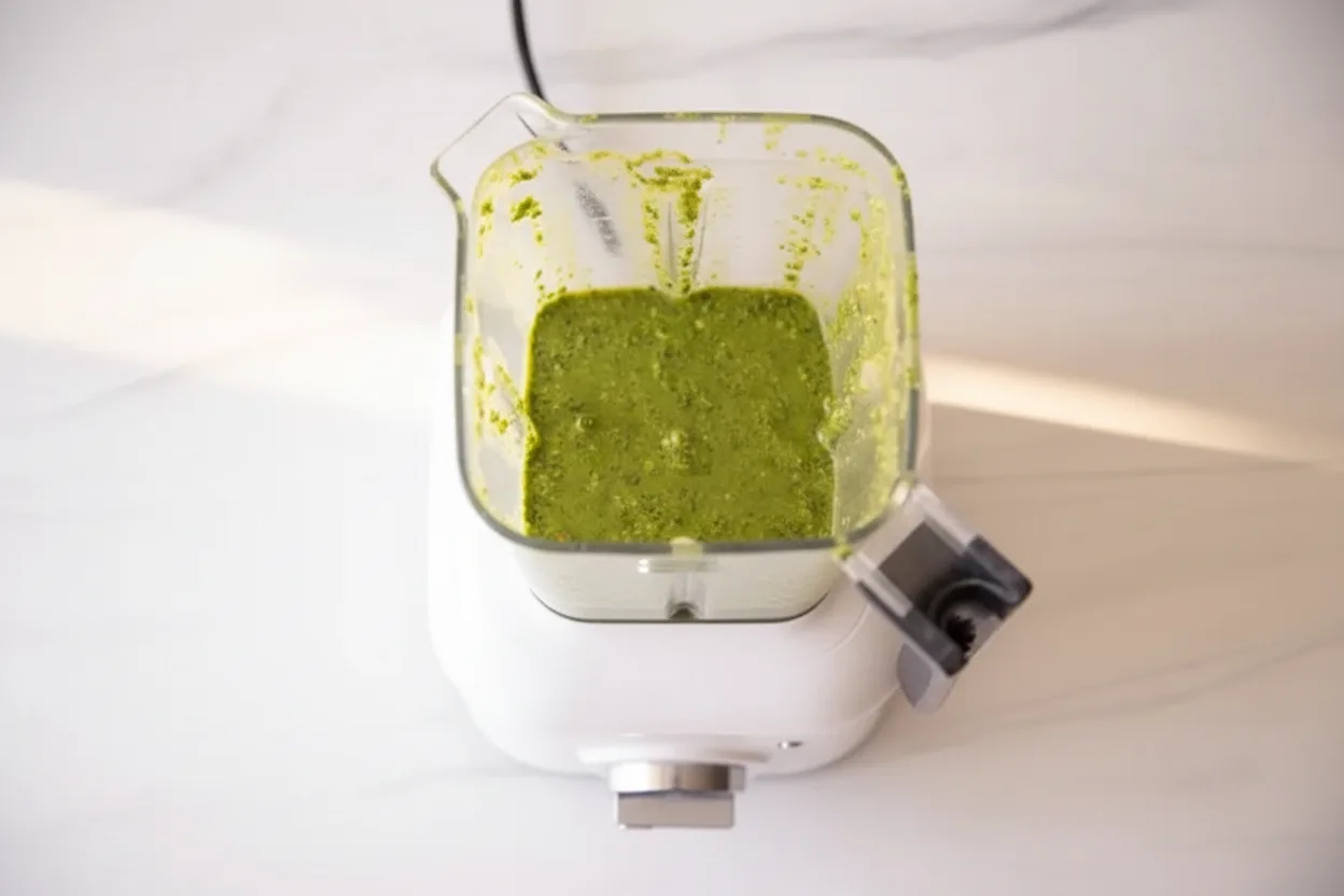 - In a blender, mix lemon juice, olive oil, basil, spinach, garlic, cashews, nutritional yeast, salt, and black pepper until smooth.