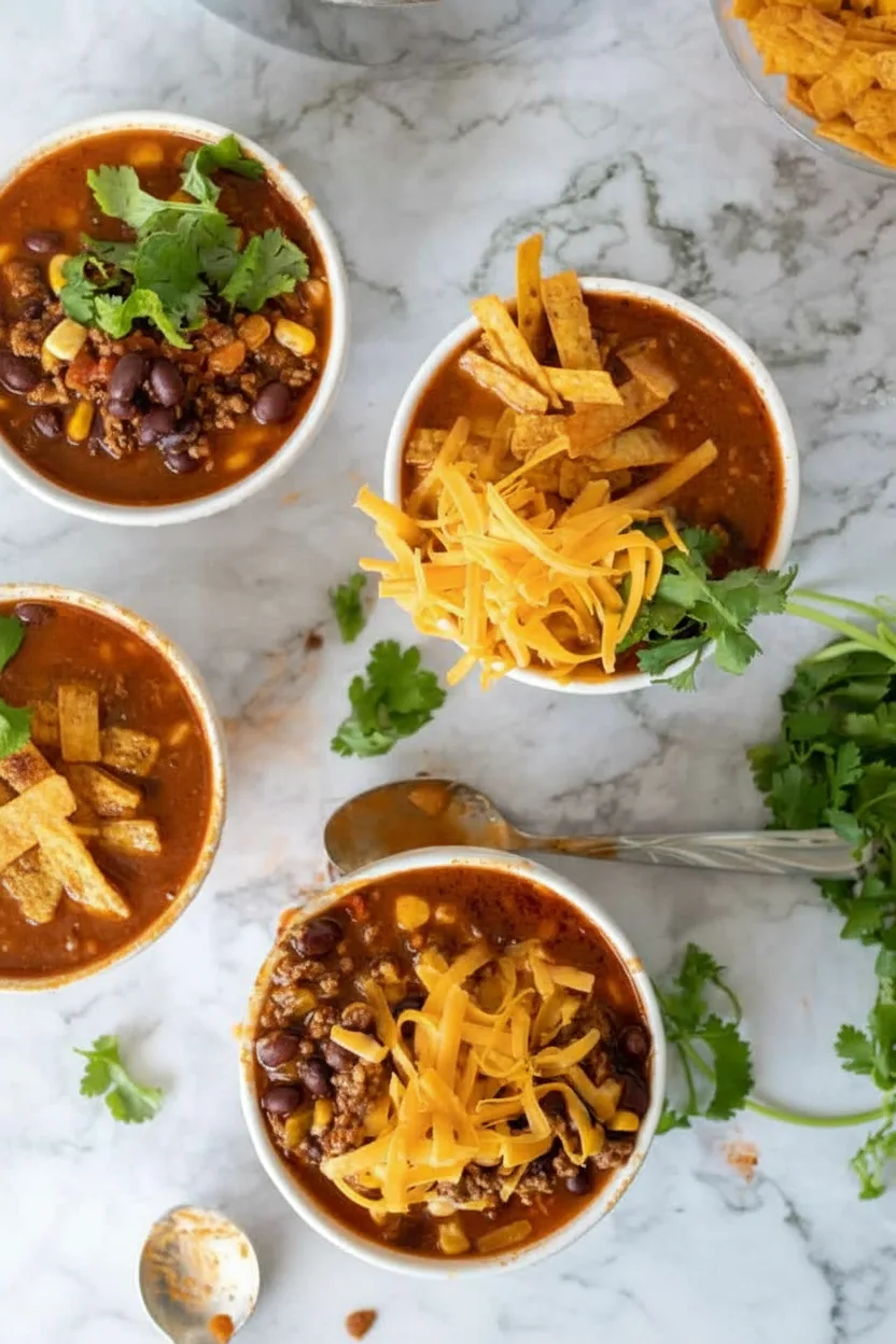Ladle soup into bowls and garnish with favorite toppings. For extra flair, try avocado slices or lime wedges alongside classics like crispy tortilla strips.