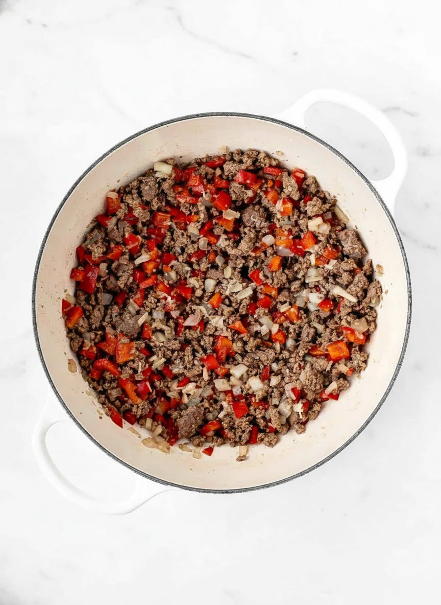 Start by heating olive oil in a Dutch oven over medium-high heat. Add ground beef, onion, and red pepper. Cook for 5-7 minutes, breaking up the meat until it’s evenly browned. Stir in garlic during the last minute – this prevents burning while maximizing flavor. Drain any excess fat if necessary.