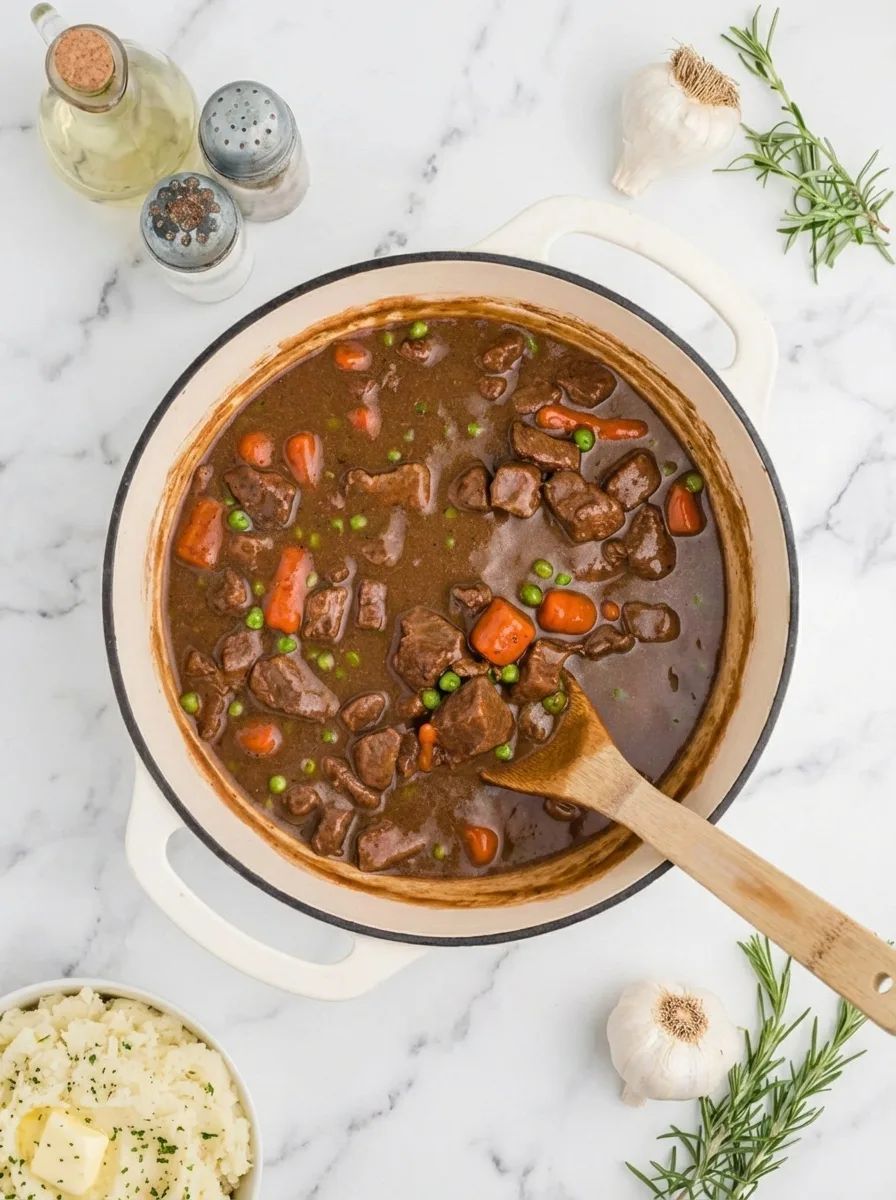 Stir in frozen peas during the last 5 minutes of cooking. Discard bay leaves before serving. Prepare mashed potatoes separately using your preferred method. Ladle stew over fluffy potato mounds for perfect plating.