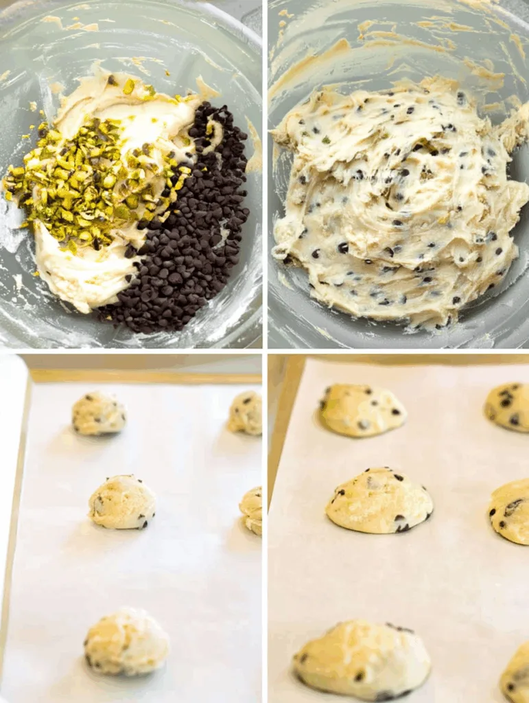 - Fold in pistachios and chocolate chips. Dough will be sticky.