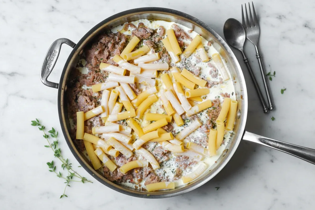 Creamy one-pot pasta with savory meat in rich tomato sauce