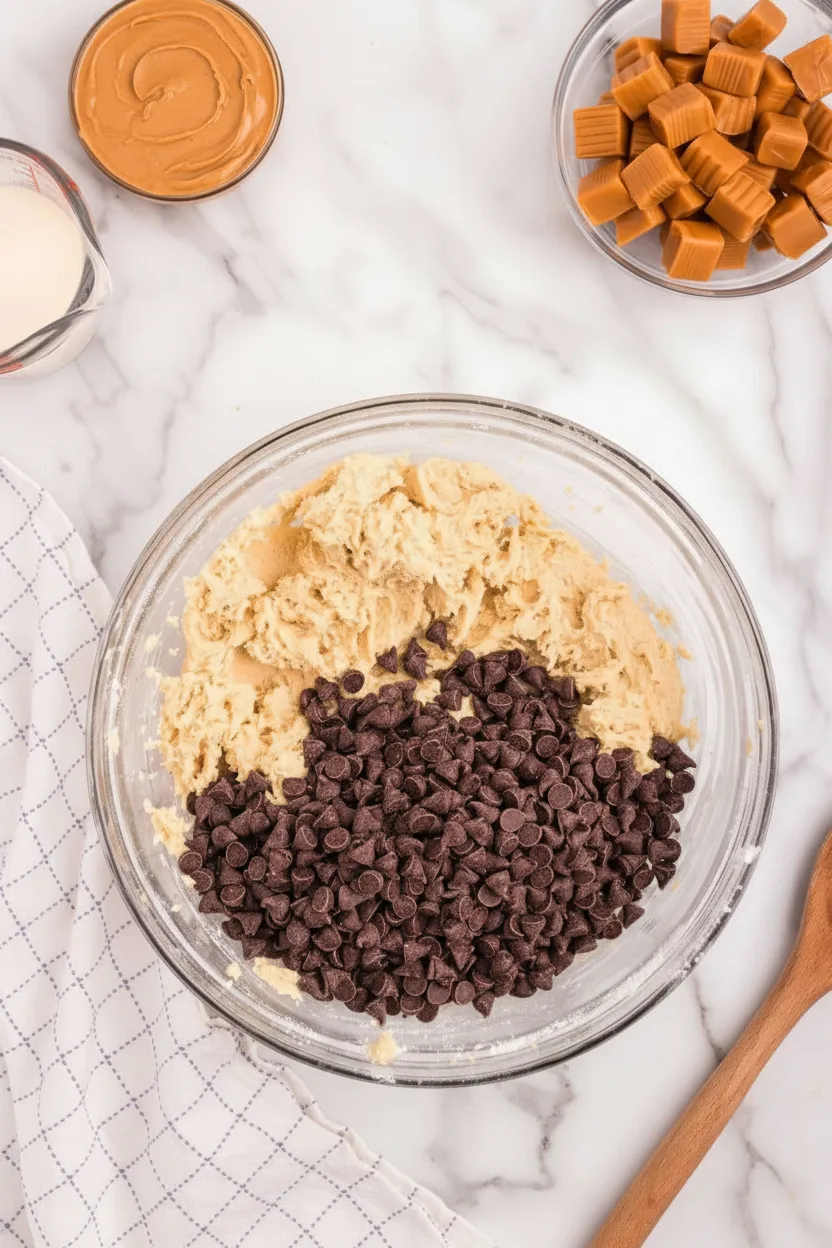 Gradually mix dry ingredients into wet ingredients until just incorporated. Gently fold in chocolate chips to avoid overmixing the dough.