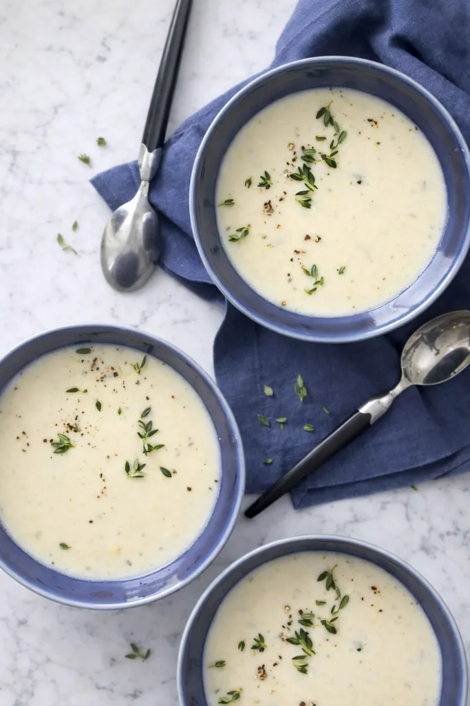 Creamy leek and potato soup made lighter without heavy cream, featuring thyme-infused broth and tangy finish from reduced-fat sour cream.
