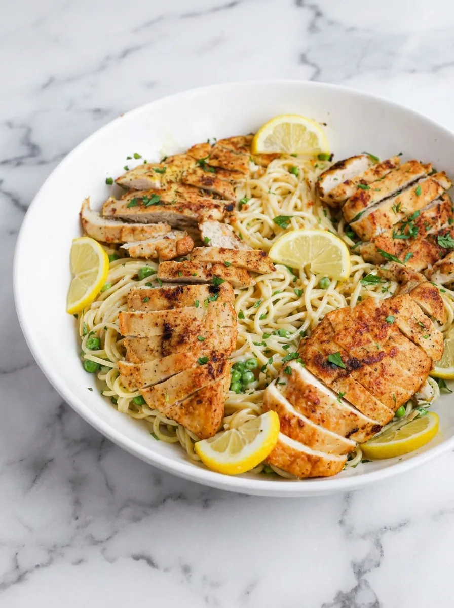 A creamy lemon chicken pasta with tender chicken and al dente spaghetti in a vibrant citrus sauce.
