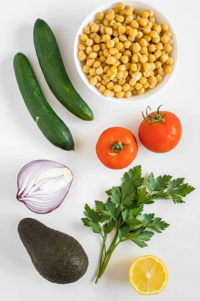 This recipe uses simple pantry staples that can be swapped for your preferences or what you have on hand. The core ingredients include about 2 cups of cooked or canned chickpeas, two medium tomatoes, two Persian or Lebanese cucumbers, a half‑cup finely diced red onion, a ripe avocado, fresh parsley, and the zest of 1‑2 lemons.