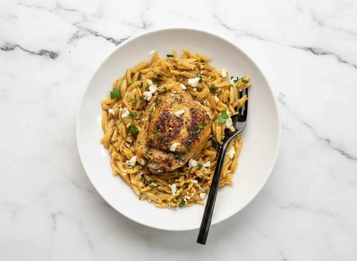 An easy, one-pan dinner featuring tender lemon pepper chicken cooked with creamy orzo pasta in a savory broth, topped with feta and parsley.