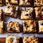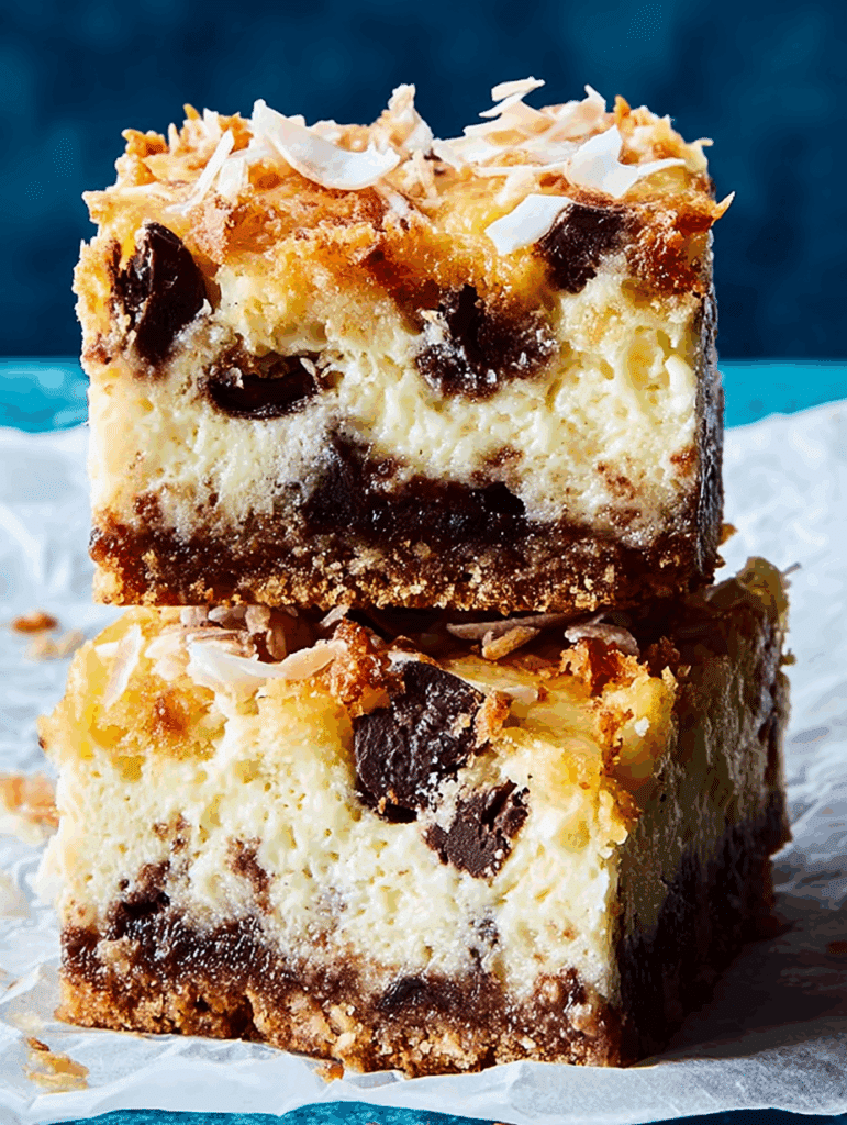Although these cheesecake bars are great year-round, they really shine during the holiday season. The chocolate, coconut, and creamy filling make them feel festive without requiring extra decorations or complicated steps. For themed occasions, you can dress them up with colored sprinkles, drizzle a bit of melted chocolate on top, or add crushed candy cane pieces in winter.