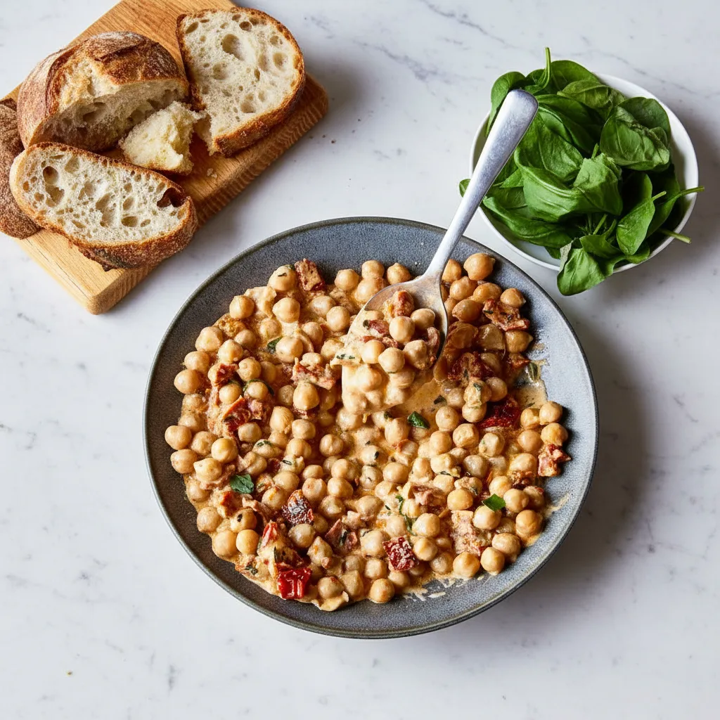 A creamy, savory, and incredibly delicious one-pan chickpea dish with sun-dried tomatoes and herbs, ready in just 25 minutes.
