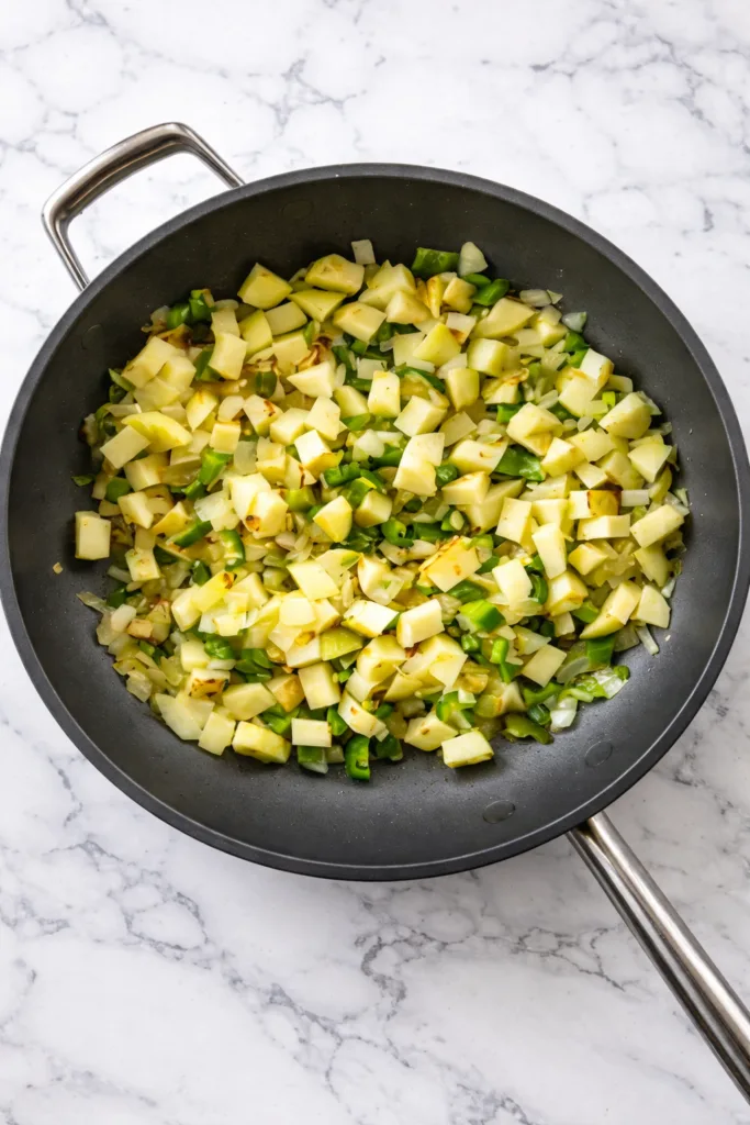 Heat olive oil in a large skillet over medium heat. Add diced potatoes, chopped onion, and jalapeno (plus serrano if using). Cook for 5 minutes until vegetables begin to soften, stirring occasionally so they cook evenly.