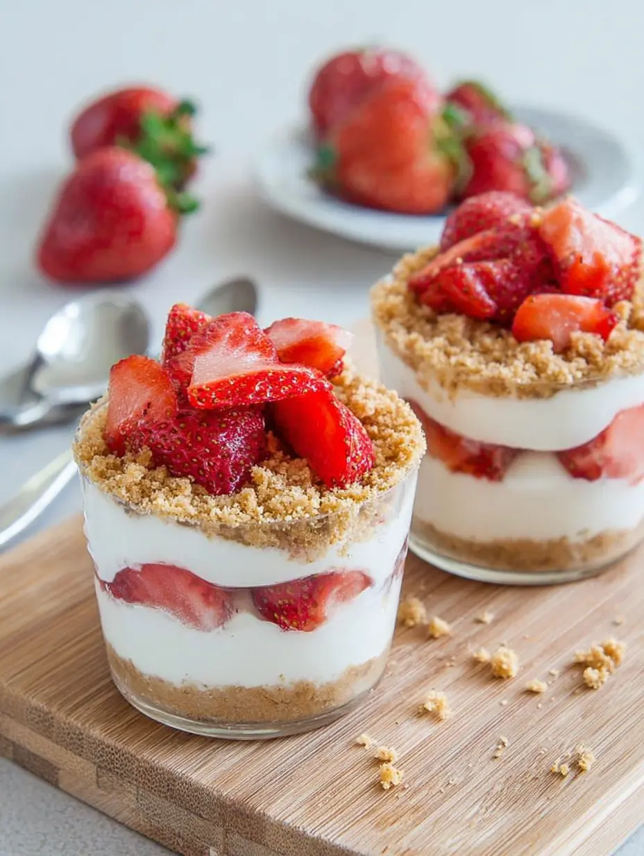 Easy, no-bake individual cheesecake parfaits with a graham cracker crust, creamy filling, and sweet macerated strawberries.
