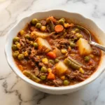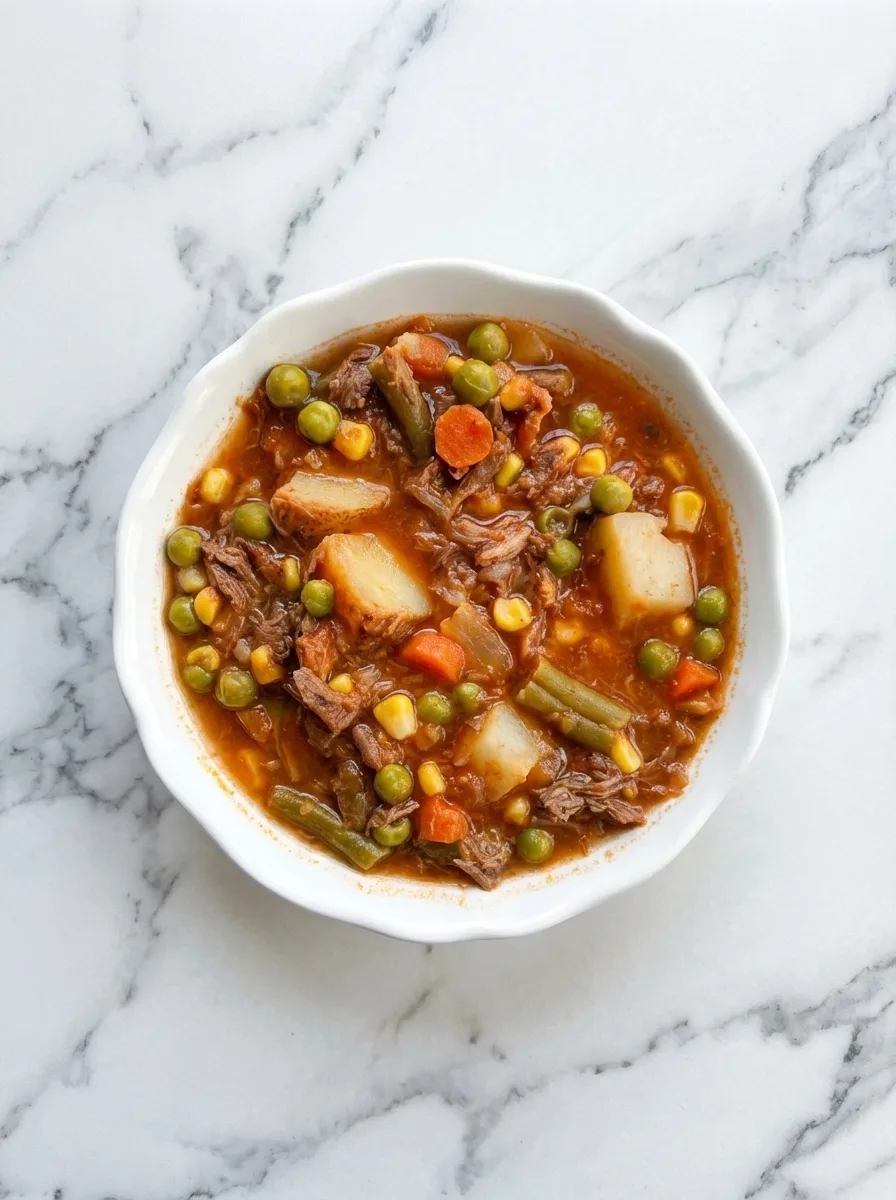 Packed with tender shredded beef, hearty vegetables, and rich tomato broth, it’s perfect for weeknight dinners or meal prep. The slow cooker does most of the work, filling your kitchen with mouthwatering aromas.