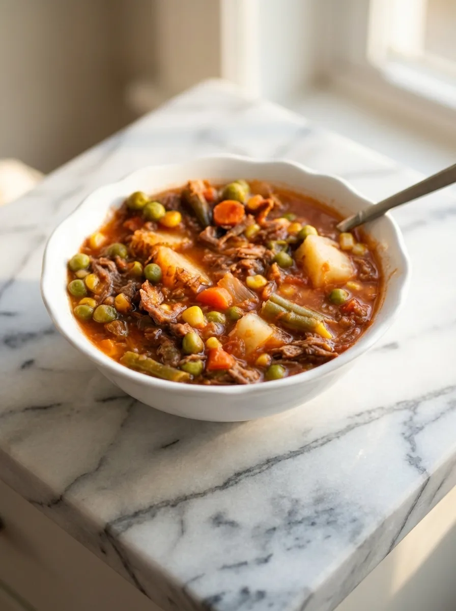 Hearty vegetable beef soup with tender shredded roast, potatoes, and garden vegetables simmered in savory tomato broth.