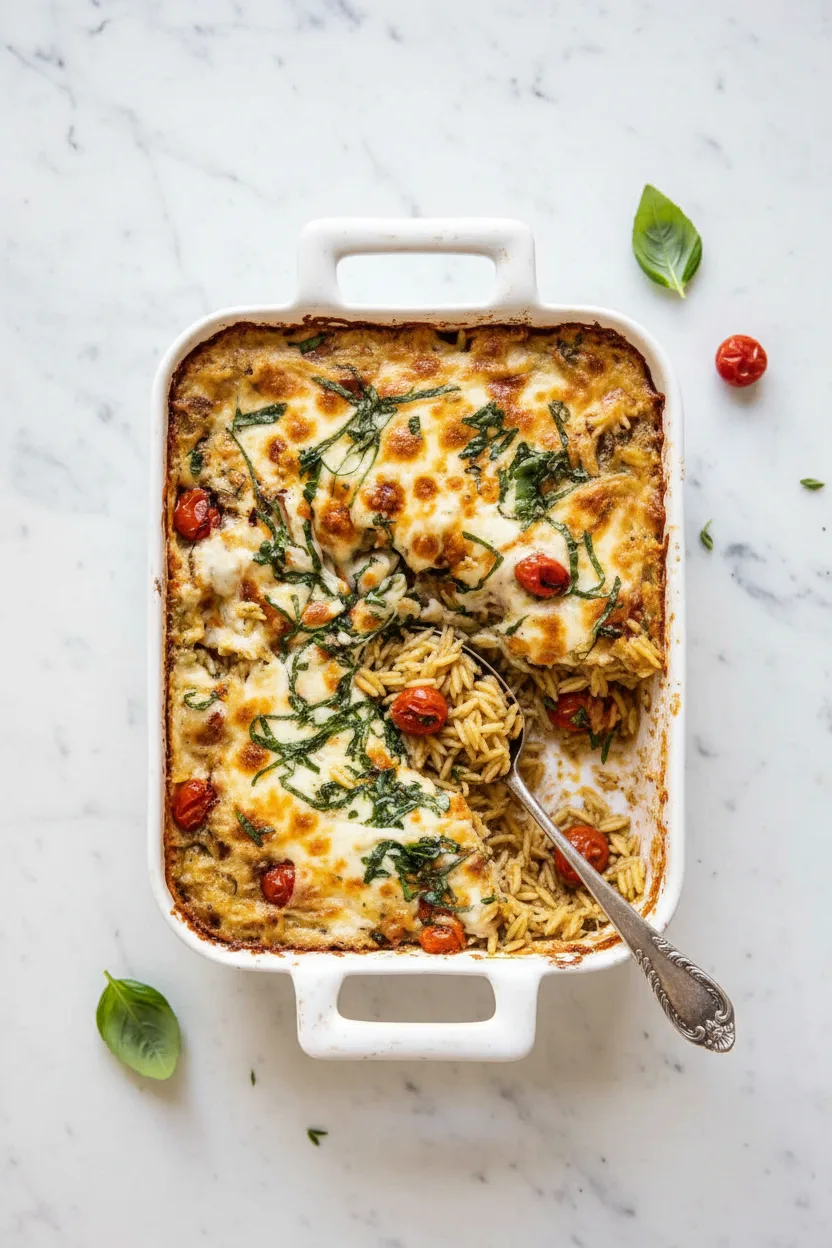 Picture this: a busy weeknight, a hungry family, and a kitchen that deserves a break. Now, imagine a single dish that solves everything. This One Pan Caprese Pesto Orzo Bake is that magical solution. It combines juicy cherry tomatoes, fragrant pesto, and creamy mozzarella cheese with tender orzo pasta, all baked together in one pan for minimal cleanup and maximum flavor.