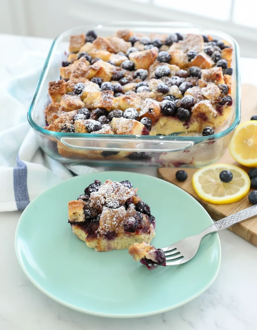 A make-ahead breakfast casserole bursting with lemon and blueberry flavors, perfect for brunch gatherings.