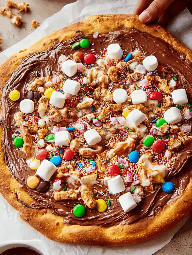 If you’re serving a crowd, consider making two pizzas with different toppings. One could be more classic with marshmallows and sprinkles. The other could lean rich and nutty with cocoa nibs, sunflower seeds, or crispy rice cereal for texture.