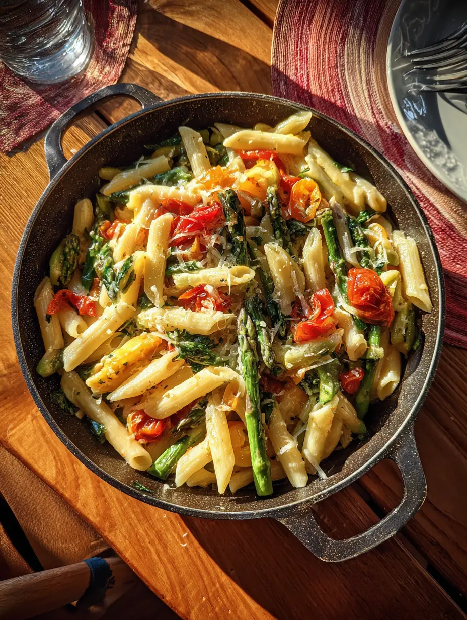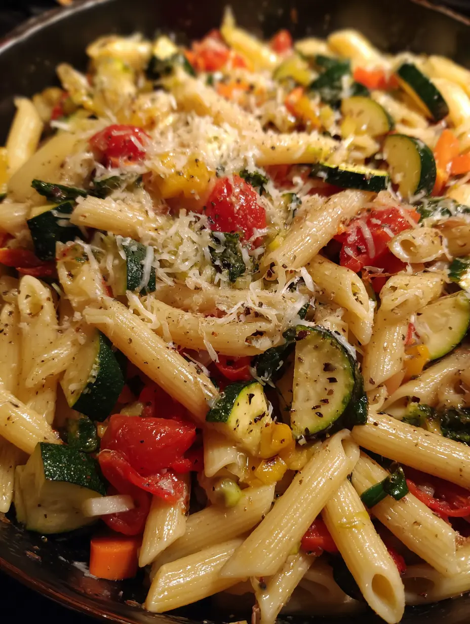 A vibrant and creamy spring pasta loaded with fresh zucchini, asparagus, bell peppers, and peas in a light Parmesan sauce.