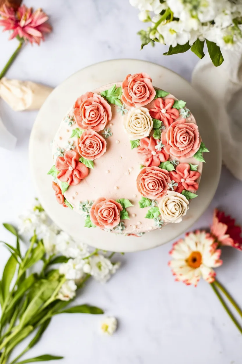 Use green-tinted frosting to pipe leaves between and around the flowers. This adds a beautiful, finished look. For a lighter side dish to balance the sweet cake, try a refreshing Greek salad with fresh feta.