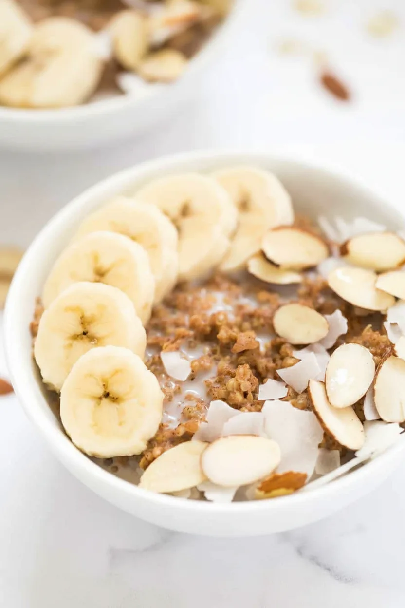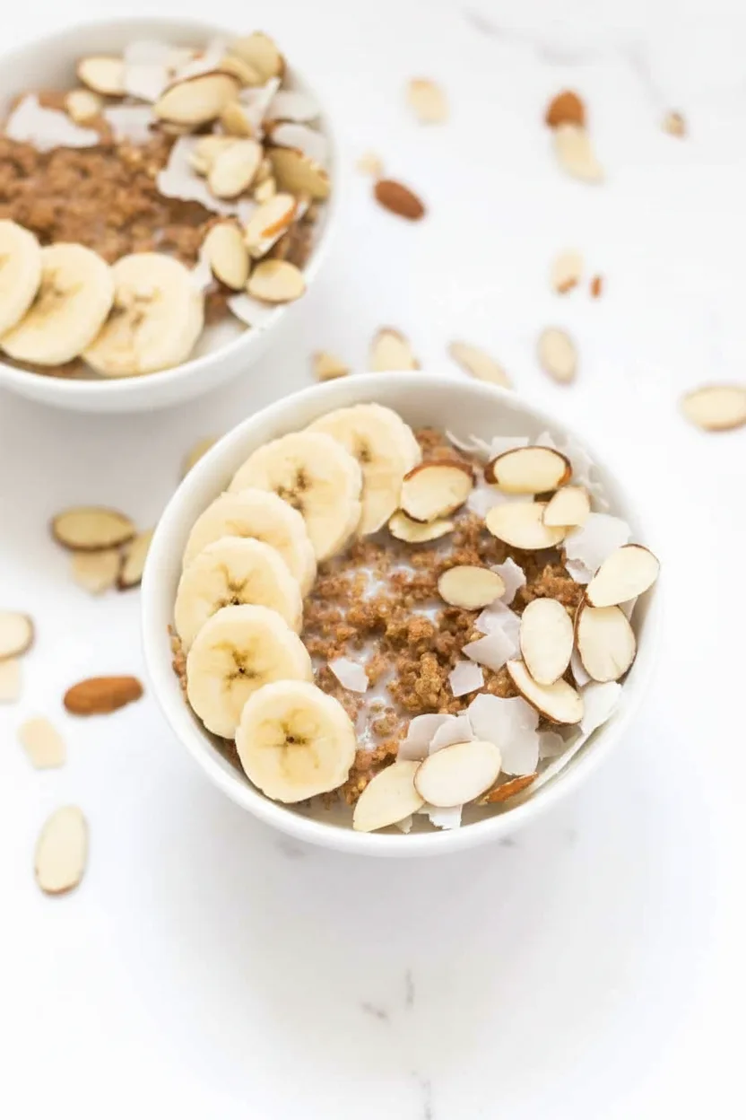 Spoon the warm quinoa mixture into two bowls. Top evenly with banana slices, toasted almonds, and coconut flakes. For presentation, arrange toppings in attractive sections rather than mixing everything together. Serve immediately while warm.