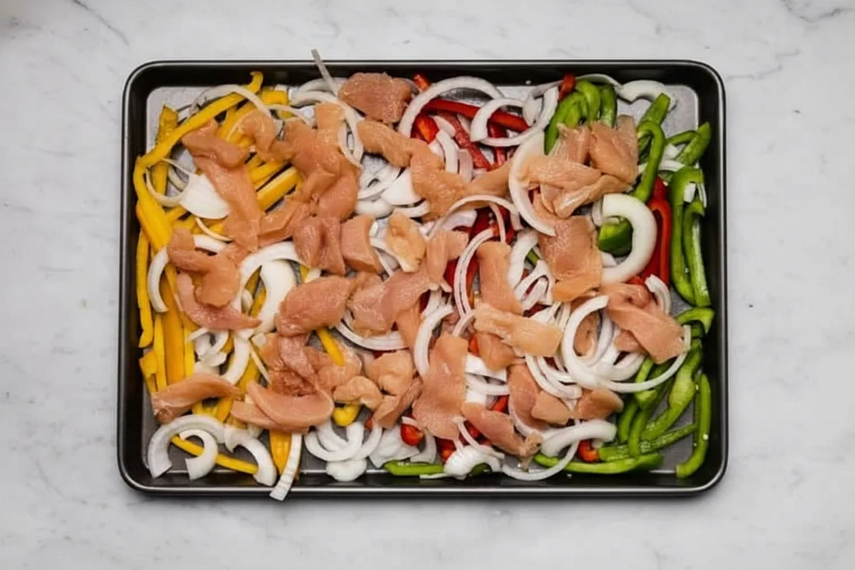 First, preheat your oven to 425°F (220°C). Lightly grease a large sheet pan with cooking spray to prevent sticking. Using a sharp knife, slice chicken breasts against the grain into even 1/2-inch strips. Core bell peppers and cut into thin slices along with onion.