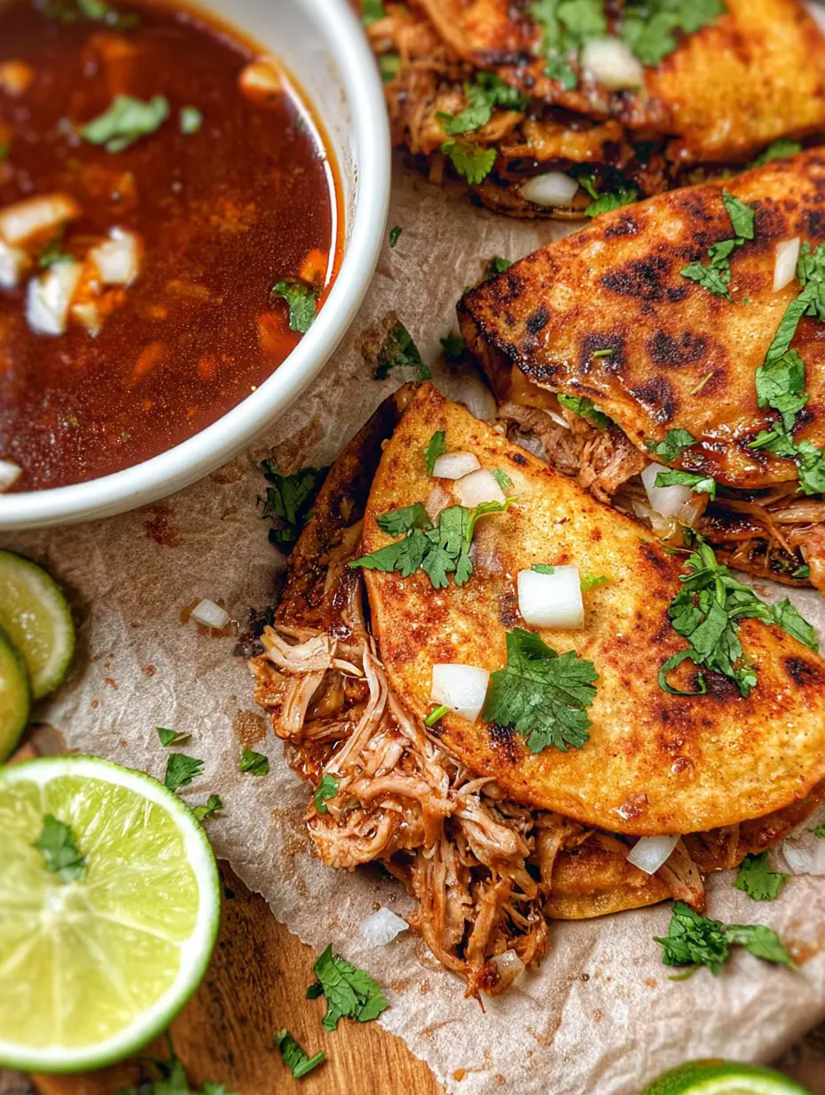 Crispy, cheesy tacos filled with tender chicken simmered in a rich, smoky chili broth, perfect for dipping.