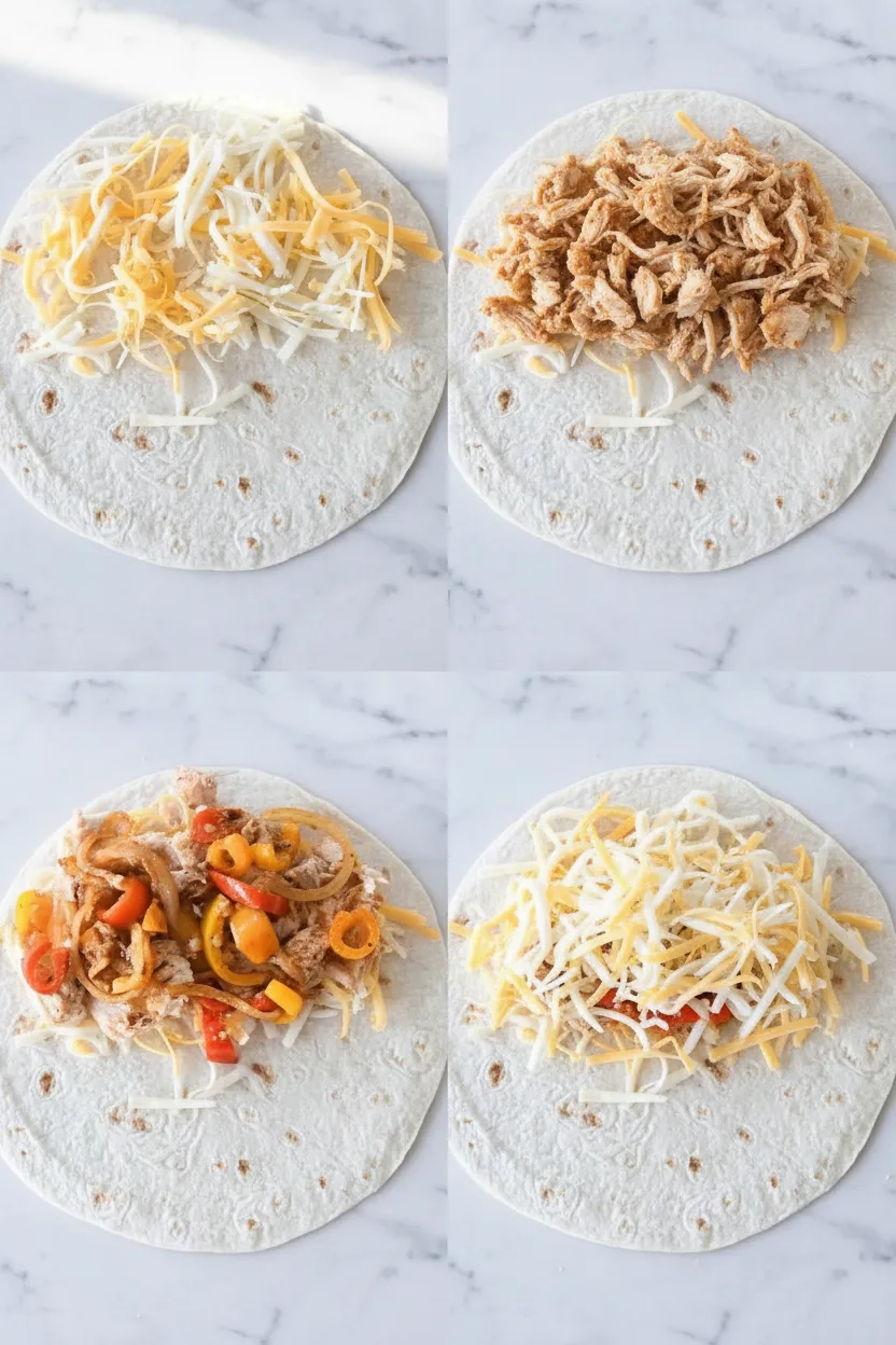 6. Assemble quesadillas: Sprinkle cheese on half of each tortilla. Top with seasoned chicken, cooked veggies, then more cheese. Fold tortillas over fillings.