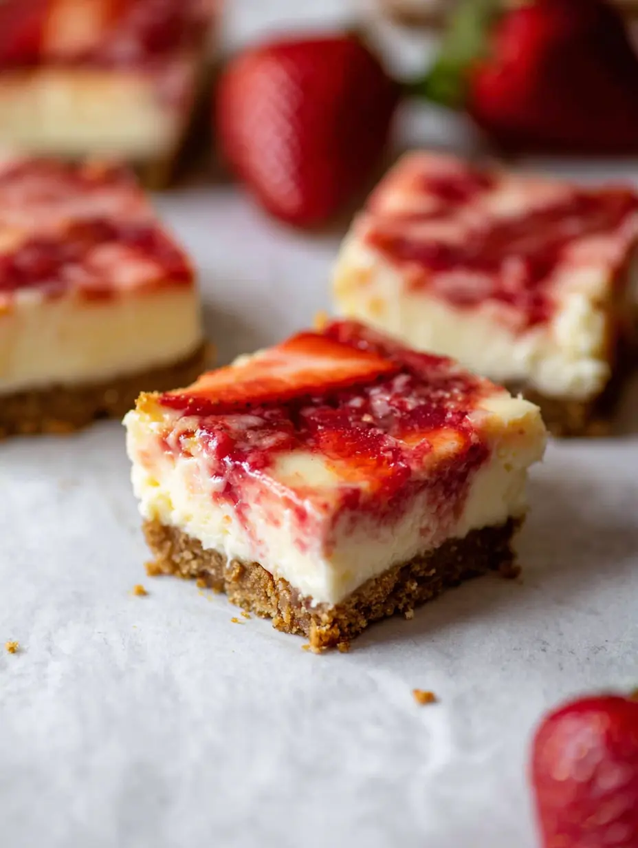 Creamy, no-fuss cheesecake bars with a buttery graham cracker crust and a beautiful swirled strawberry topping.